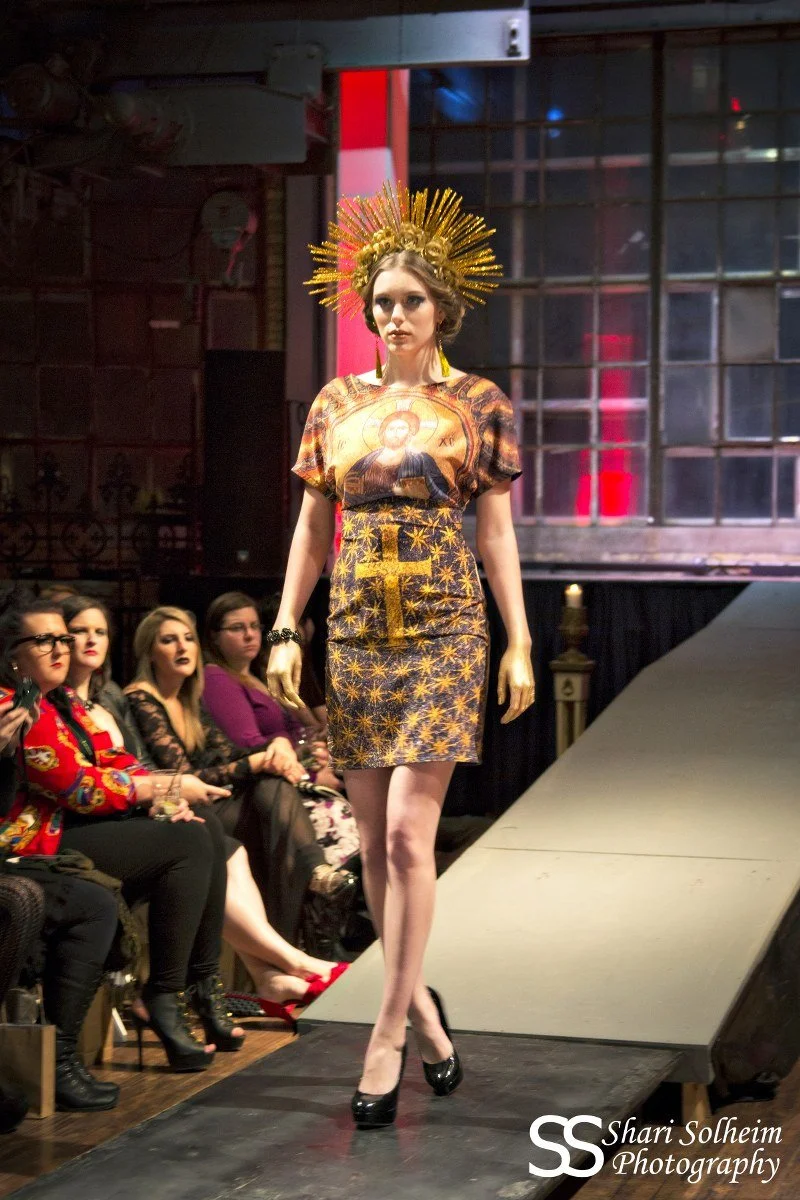 Named after the Byzantine Empire’s Leo III, this dress is made from custom-printed silky faille of Byzantine mosaics. The bodice of the dress has a relaxed fit, and will fit up to a 36” bust. The waist is fitted and will fit 26-27”, and the hips will fit up to 37”. It has a zipper at the back, and a split at the back hem. This is a runway sample and is sold as-is.