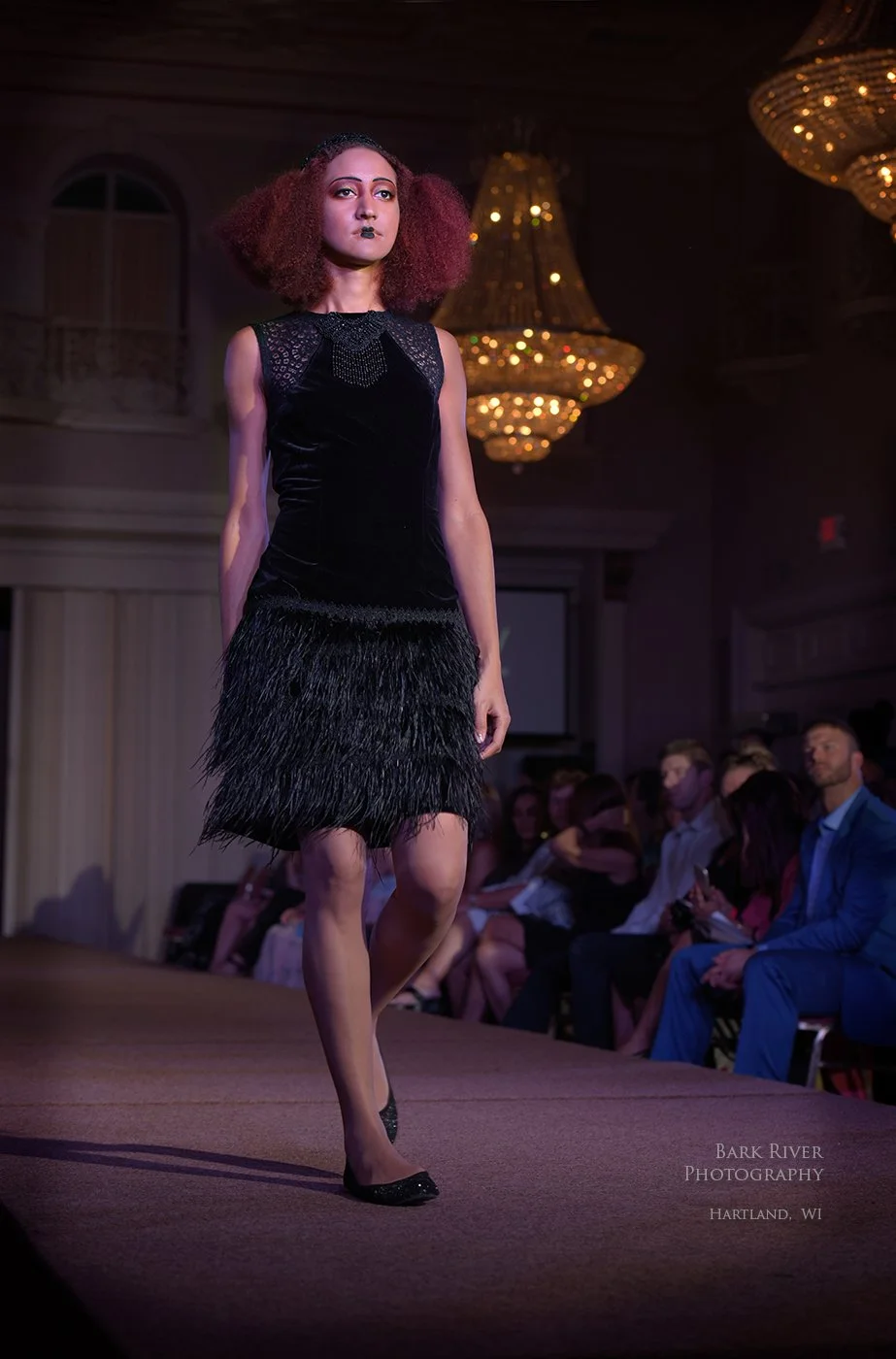 This mini velvet dress features a lace cut-out at the shoulders. The neckline has a beaded applique, and the hips have layers of feather trim. The side seam has an invisible zipper closure. It will best fit up to a 35” bust, 26” waist and 35” hips.