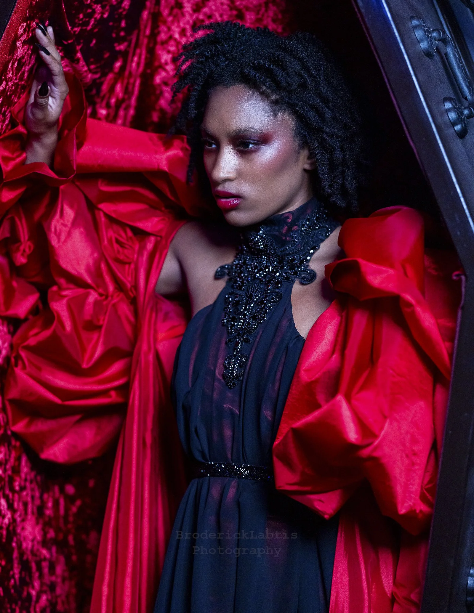 Mesmerize your next meal in this magnificent crimson cloak. Made from taffeta, the cloak features extreme leg o’mutton sleeves with flounces at the wrists, a high and gathered collar, and a pleated Watteau back. It will best fit someone with a back width/diameter of 15” of less, and a height of 5’8” or taller.
