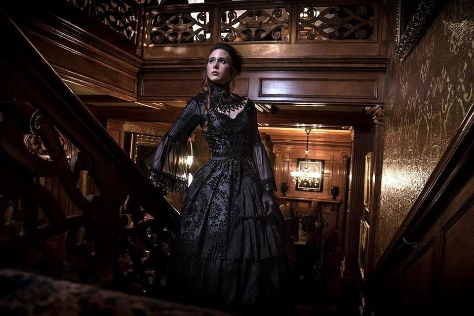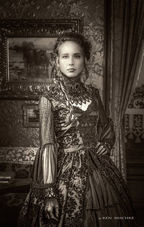 This Rococo-inspired dress is made from flocked black taffeta and chiffon, trimmed with venise lace. It features an invisible side zipper and lacing down the back for a perfect fit every time. It will fit up to a 34” bust and a 25” waist. This does not come with the floor-length tiered skirt, as is seen in the photos here. This is a one-of-a-kind sample piece and is sold as-is.