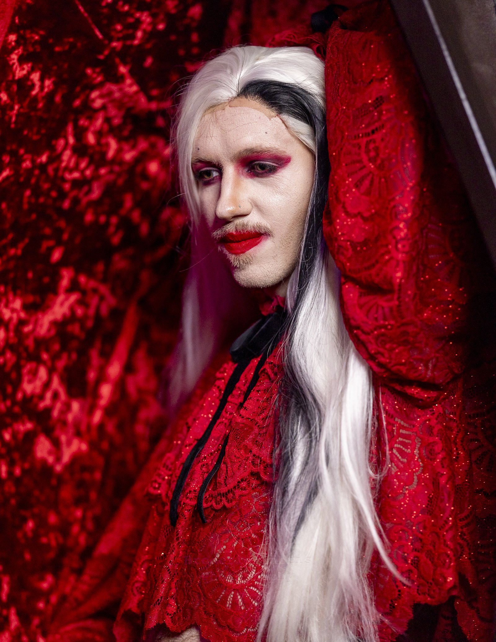 This One-Of-A-Kind red lace knit cropped blouse is covered in red glitter, featuring a hi-lo hem. It has black velvet ties at the wrists to accentuate the extra flouncy sleeves, and the attached ascot closes in back with a black velvet ribbon featuring a hook and eye closure. Entice your fellow creatures of the night in this slinky little number! Only one available!